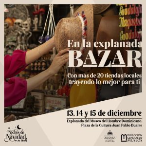 BAZAR en la Explanada Fecha: 12, 13 y 14 de diciembre Hora: No especificada Lugar: Museo del Hombre Dominicano Información adicional Evento tipo bazar con
