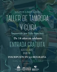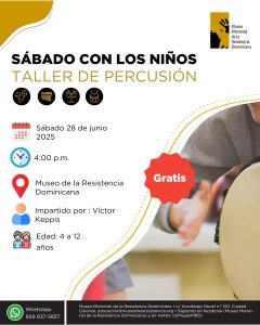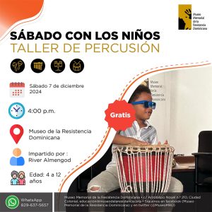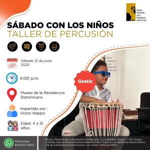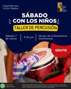 SÁBADO CON LOS NIÑOS TALLER DE PERCUSIÓN Fecha: Sábado 7 de febrero Hora: 4:00 pm Lugar: Museo de la Resistencia Dominicana Información adicional Impartido por: