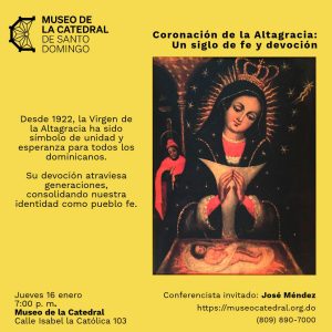 La Altagracia Conferencia Audiovisual: Antecedentes Iconográficos Fecha: 30 de enero, 2026 Hora: 7:00 P. M. Lugar: Claustro del Museo de la Catedral de Santo Domingo