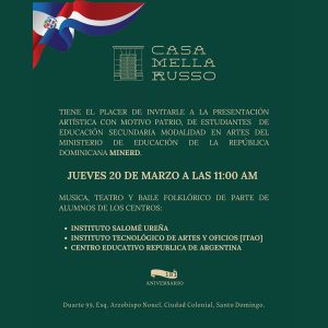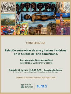 CONFERENCIA: ARTE Y ARQUITECTURA Fecha: Sábado 14 de marzo Hora: 10:30 AM Lugar: Casa Mella Russo. C/ Duarte 99, Ciudad Colonial, Sto Dgo. Información adicional