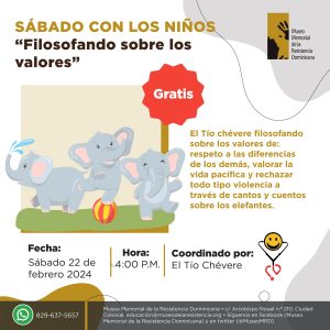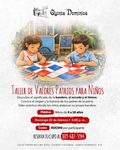 TALLER DE VALORES PATRIOS PARA NIÑOS Quinta Dominica Fecha: Domingo 22 de febrero Hora: 4:00 p.m. Lugar: Calle Padre Billini #202, Ciudad Colonial, Santo Domingo,