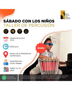 SÁBADO CON LOS NIÑOS Taller de Percusión Fecha: Sábado 7 de marzo Hora: 4:00 pm Lugar: Museo de la Resistencia Dominicana Información adicional Impartido por:
