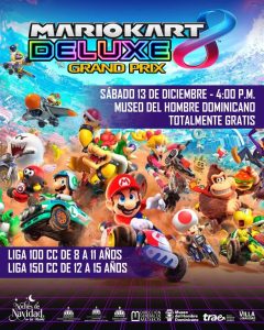 Mario Kart 8 Deluxe – Grand Prix Fecha: Sábado 13 de diciembre Hora: 4:00 P.M. Lugar: Museo del Hombre Dominicano Información adicional Liga 100 CC: