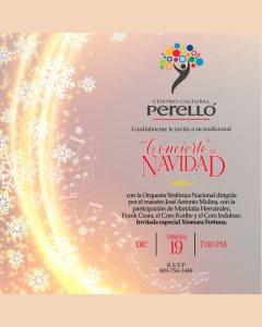 Concierto de Navidad – Centro Cultural Perelló Cordialmente le invita a su tradicional Concierto de Navidad Fecha: Viernes 19 de diciembre Hora: 7:00 P.M. Lugar: