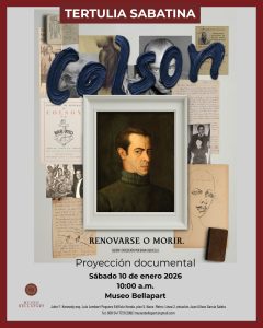 Tertulia Sabatina – Colson Renovarse o morir. Proyección documental. Fecha: Sábado 10 de enero 2026 Hora: 10:00 a.m. Lugar: Museo Bellapart Información adicional Guion y