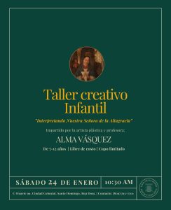 Taller creativo Infantil «Interpretando Nuestra Señora de la Altagracia» Fecha: Sábado 24 de enero Hora: 10:30 AM Lugar: Casa Mella Russo (C/Duarte 99, Ciudad Colonial,
