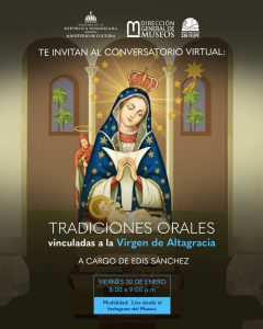 Tradiciones Orales vinculadas a la Virgen de Altagracia Conversatorio Virtual Fecha: Viernes 30 de enero Hora: 8:00 a 9:00 p.m. Lugar: Live desde el Instagram