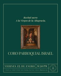 Recital sacro A la Virgen de la Altagracia Coro Parroquial Israel Fecha: Viernes 23 de enero Hora: 6:30 PM Lugar: C/ Duarte 99, Ciudad Colonial,