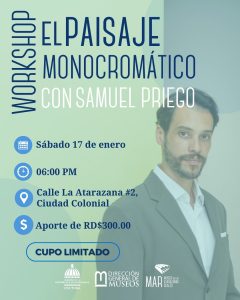 El Paisaje Monocromático con Samuel Priego Workshop Fecha: Sábado 17 de enero Hora: 06:00 PM Lugar: Calle La Atarazana #2, Ciudad Colonial Información adicional Facilitador:
