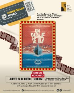 Cinefórum MMRD: Un Pasaje de Ida Proyección de la película de Agliberto Meléndez Fecha: Jueves 22 de enero Hora: 6:00 PM Lugar: Auditorio Alma y