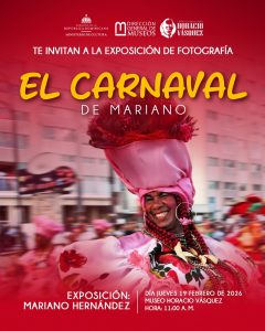 El Carnaval de Mariano Exposición de fotografía Fecha: Jueves 19 de febrero de 2026 Hora: 11:00 A. M. Lugar: Museo Horacio Vásquez Información adicional Exposición