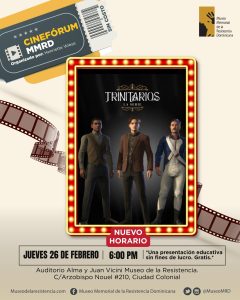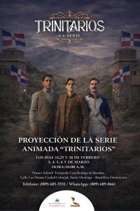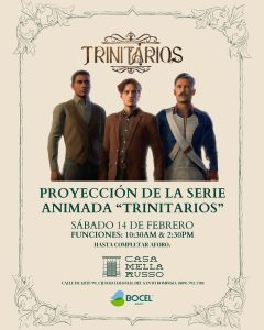 Proyección de la serie animada «Trinitarios» Fecha: Sábado 14 de febrero Hora: Funciones: 10:30 a.m. & 2:30 p.m. Lugar: Casa Mella Russo Información adicional Acceso: