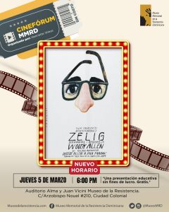 CINEFÓRUM MMRD Proyección de la película “Zelig” Fecha: Jueves 5 de marzo Hora: 6:00 pm Lugar: Auditorio Alma y Juan Vicini, Museo de la Resistencia