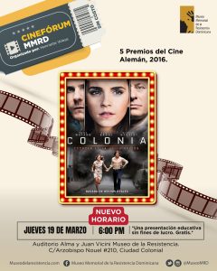 CINEFÓRUM MMRD: COLONIA Escapar es la única opción Fecha: Jueves 19 de marzo Hora: 6:00 PM Lugar: Auditorio Alma y Juan Vicini Museo de la
