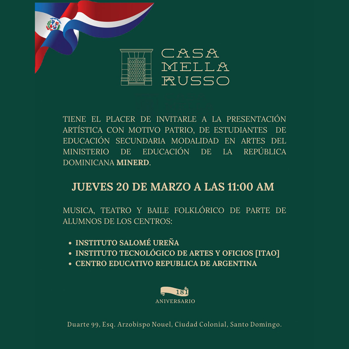 • Lugar: Casa Mella Russo, Duarte 99, Esq. Arzobispo Nouel, Ciudad Colonial, Santo Domingo