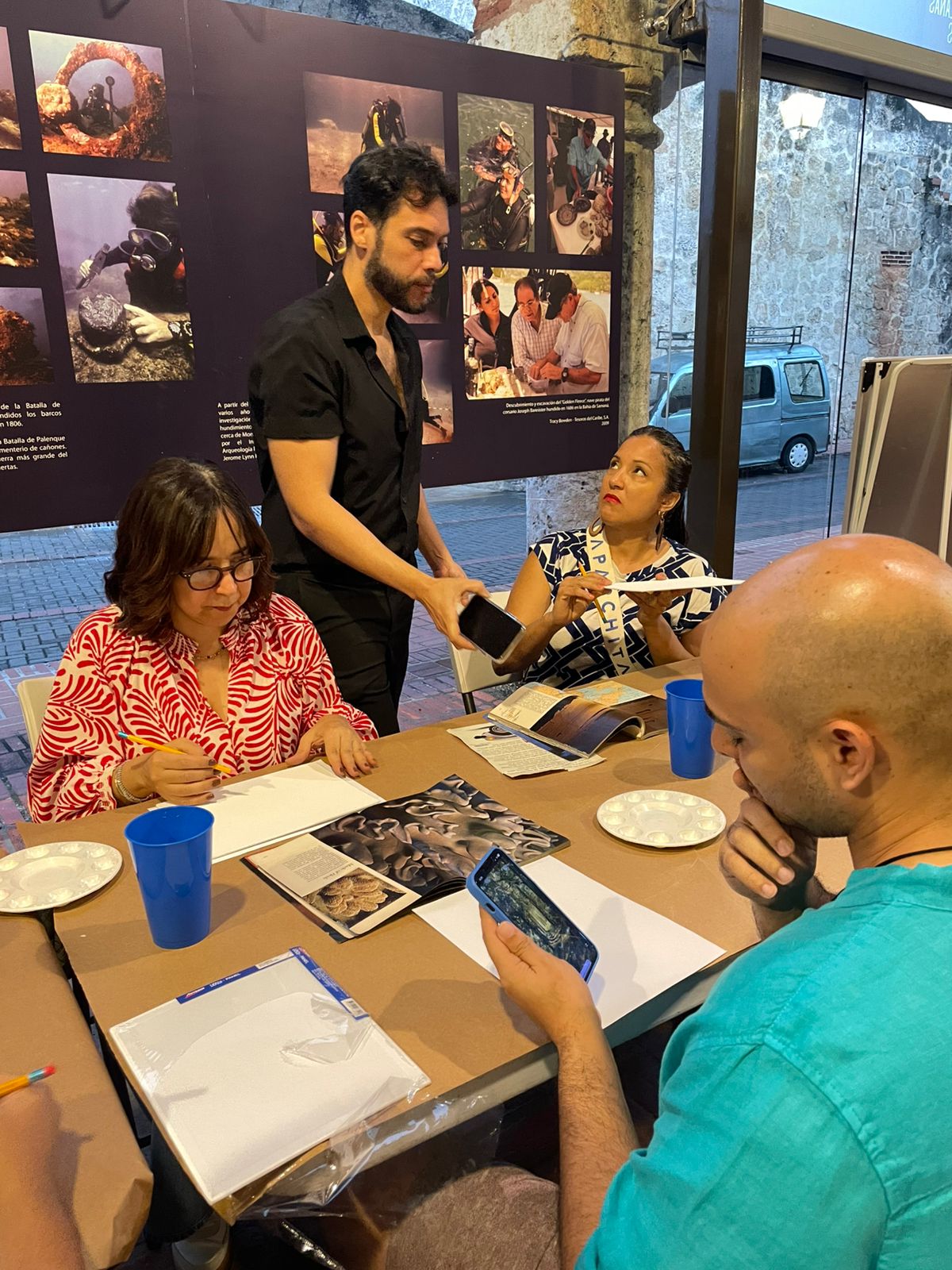 Durante el taller, los asistentes encontraron inspiración tanto en el material didáctico proporcionado como en la exposición fotográfica “Profundidades que cuentan historias”, actualmente exhibida en el lobby del museo. Esta muestra reúne imágenes de distintas expediciones de arqueología subacuática realizadas en el litoral dominicano, que revelan hallazgos y narrativas vinculadas al patrimonio marítimo del país.
